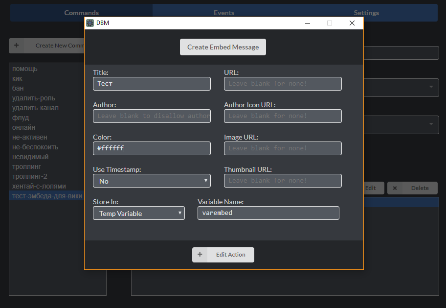 2.1. Вписываем заголовок эмбеда, URL, Автора, цвет, изображение. Потом пишем в "Variable Name", например, "varembed" и сохраняем.