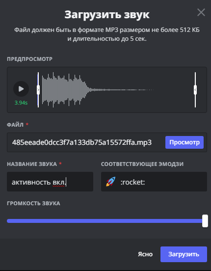 тут вы можете загрузить звук, назвать его, и указать эмодзи который будет появляться при использовании звука: